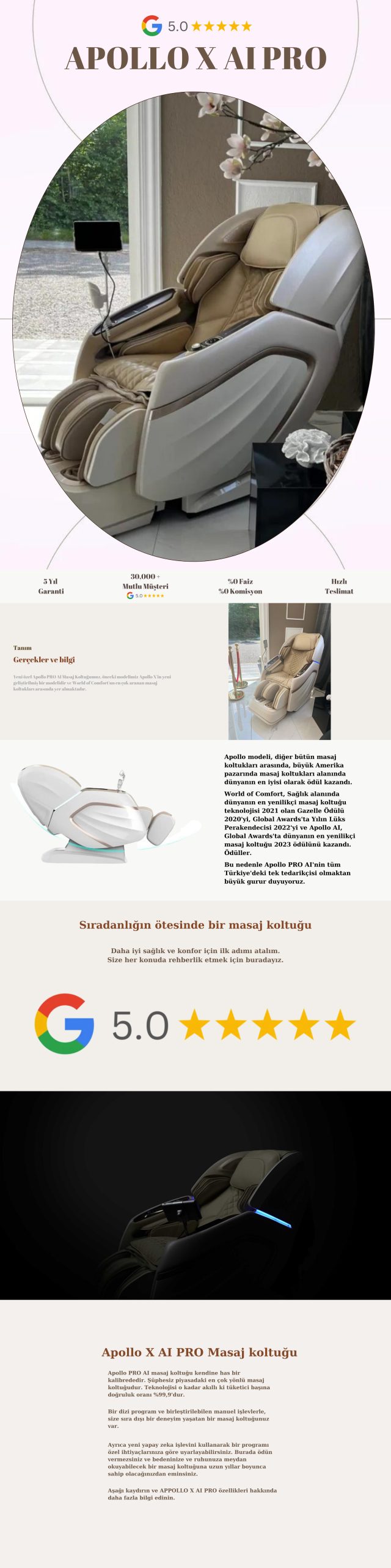 WOC Apollo Masaj Koltuğu, yapay zeka teknolojisi ile donatılmış üstün bir lüks masaj koltuğu deneyimi sunar. Vücudunuzu baştan ayağa tarayarak ihtiyacınız olan noktaları algılar ve kişiselleştirilmiş masaj uygular. İster evinizde ister ofisinizde kullanın, Apollo masaj koltuğu stress azaltma, kas gevşetme, kan dolaşımını iyileştirme ve tam bir rahatlama sağlamak için tasarlanmıştır. Modern tasarımı sayesinde sadece bir masaj koltuğu değil, aynı zamanda şık bir dekor parçasıdır. Uzun ömürlü malzemeler ve ileri teknoloji motorlarla üretilen Apollo, yıllarca güvenilir kullanım sunar.